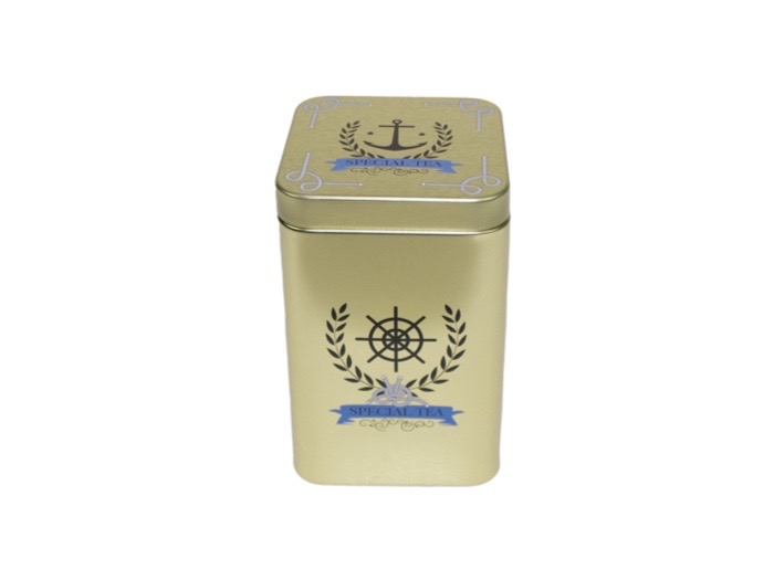 Fin guldfärgad plåtburk med texten ”Finest Tea”