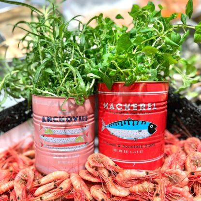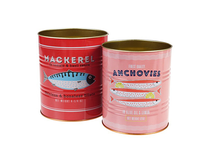 Två förvaringsburkar i retrostil med fiskmotiv. Ett snyggt sätt att lagra köksredskap, pennor eller bara ha som en dekorativ burk på en hylla.