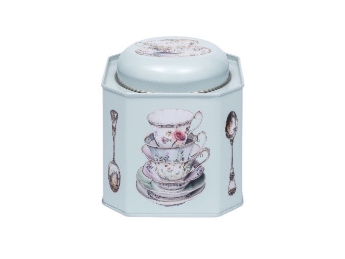 Plåtburk 200g– En dekorativ plåtburk i ljusblått med romantiskt motiv av staplade tekoppar och vintagebestick. Perfekt för förvaring av te, kaffe eller småkakor.