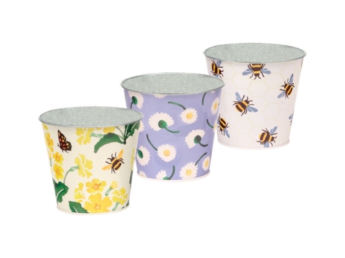 Tre fina plåtkrukor i design Emma Bridgewater. Ett snyggt sätt att förvara pennor eller småsaker i. Även fina att plantera i. Använd då en plastinsats.