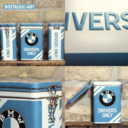 400 g plåtburk med knäpplock i BMW-tema i blått och vitt, dekorerad med logotyp och texten ”Drivers Only” i sportig, modern design.