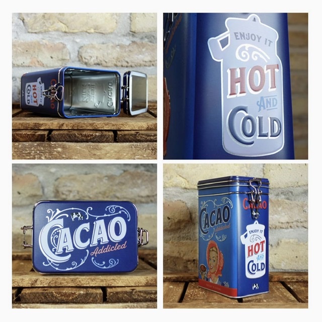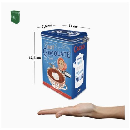 Perfekt plåtburk att förvara antingen sitt cacaopulver eller drickchoklad i. Plåtburken har tättförslutande knäpplock och på ena sidan av plåtburken står texten ” Hot Chocolate” och på andra sidan ”Cacao”. Plåtburken är i matt och präglad kvalité.