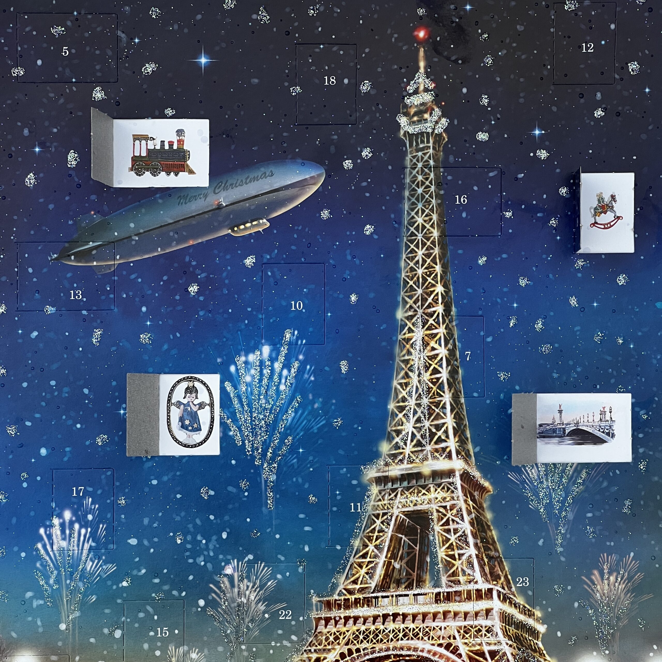 Adventskalender med silverglitter och 24 luckor. Vackert motiv av Eiffeltornet. Vive La France, det är så vackert vid jul i Paris. Med denna adventskalender kan du njuta av stämningen framför Eiffeltornet med julmarknad, dekorationer och glada människor. En julkalender som kommer att inspirera alla Parisälskare. Bakom varje lucka finns bilder på sevärdheter i Paris, eller historiska leksaker.