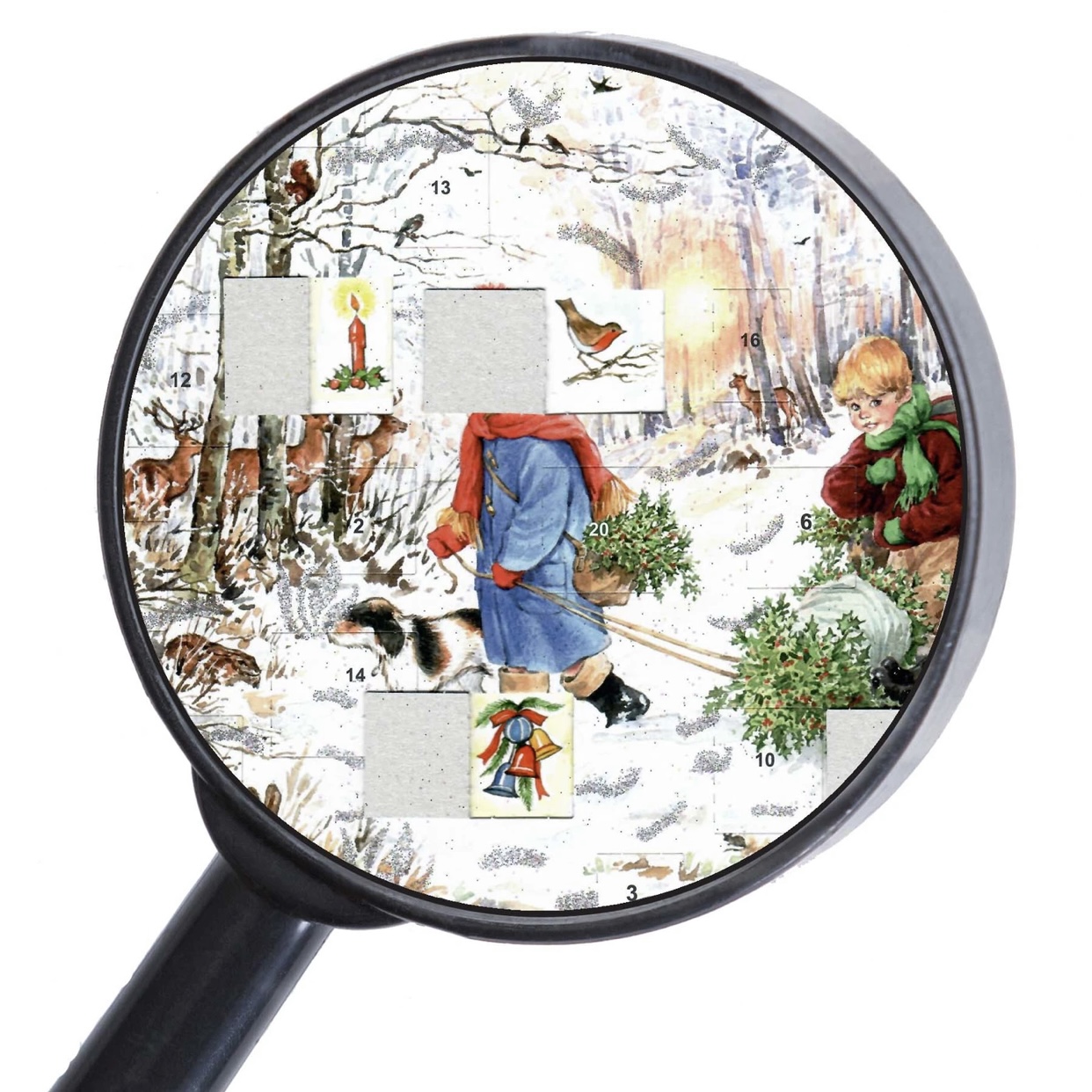 Adventskalender med silverglitter och 24 luckor att öppna. Nytryck från 1970.