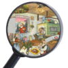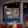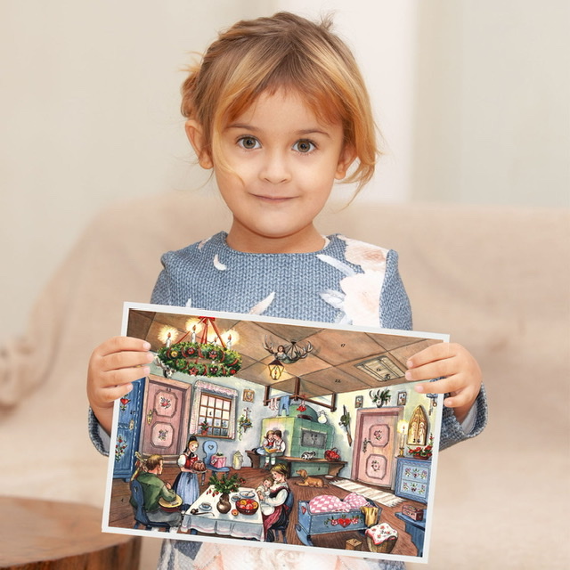 Adventskalender med silverglitter och 24 luckor. Nytryck från slutet av 1940-talet. Förr i tiden firades julen i en typisk bondgård. Barnen värmer sig vid kakelugnen, det finns bakverk och små julklappar och adventskransen över bordet brinner med fyra ljus. Julafton är här. En stämningsfull adventskalender som följer dig genom adventstiden.
