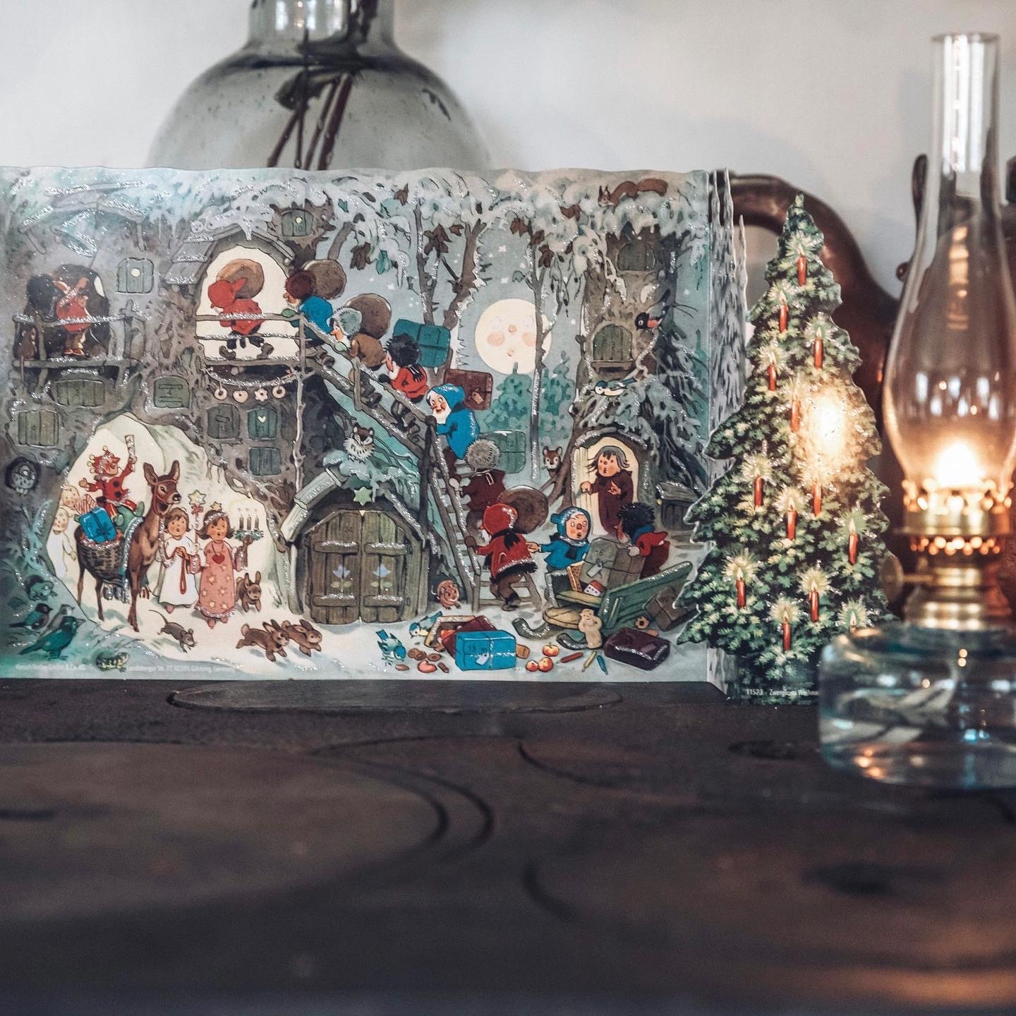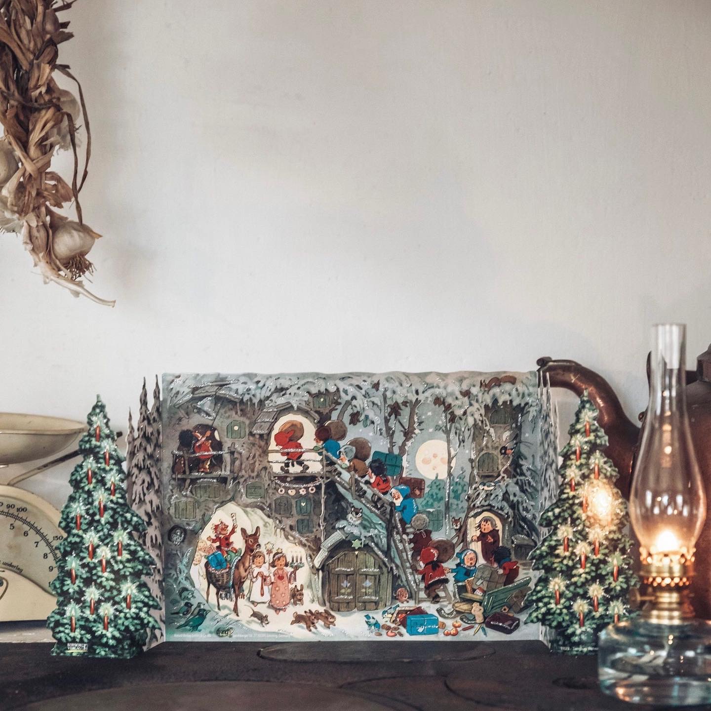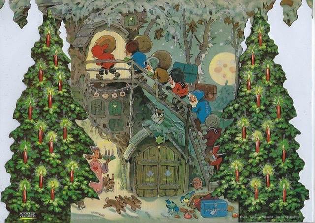 Fritz Baumgarten (1883-1966) skapade en vacker julvärld med sina iscensatta pixieillustrationer. Först publicerad på 50-talet och nu återutgiven i samma utförande. Denna adventskalender som kan vikas ut är en riktig nostalgisk skatt!