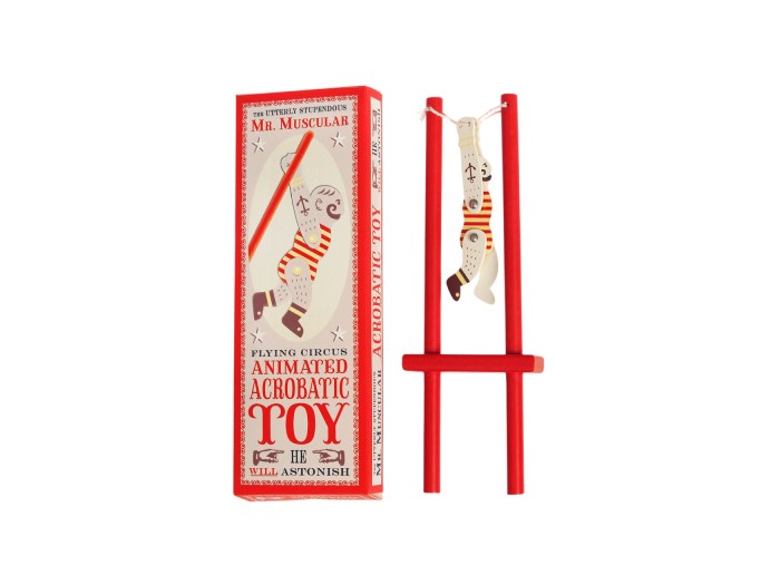Säg hej till den helt fantastiska Mr. Muscular trapetsleksaken i trä. Kläm helt enkelt ihop handtaget för att få Mr. Muscular att utföra sina helt fantastiska bedrifter.