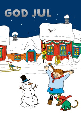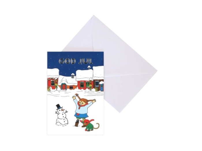 Julkort med motiv av Pippi Långstrump och Herr Nilsson i snölandskap framför röda trähus. Text: “God Jul” i metallic mot mörkblå bakgrund. Levereras med vitt kuvert. Tillverkat i papp av hög kvalitet.