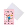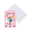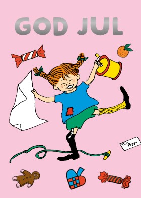 Julkort med motiv av Pippi Långstrump. Text: “God Jul” i metallic mot rosa bakgrund. Levereras med vitt kuvert. Tillverkat i papp av hög kvalitet.