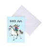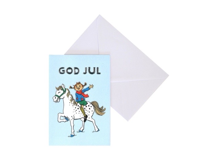 Julkort med motiv av Pippi Långstrump och Lilla Gubben i snölandskap. Text: “God Jul” i metallic mot ljusblå bakgrund. Levereras med vitt kuvert. Tillverkat i papp av hög kvalitet.