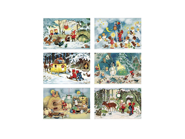 Dubbelt kort med kuvert 24 luckor att öppna. 6-olika med glitter. Adventskalender.