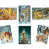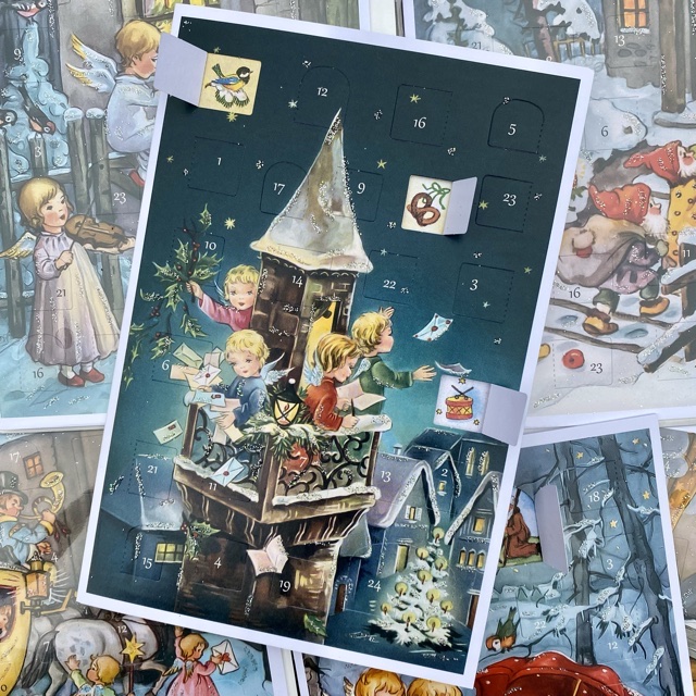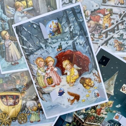 6-olika. Dubbelt kort med kuvert. Adventskalender med silverglitter och 24 luckor att öppna.