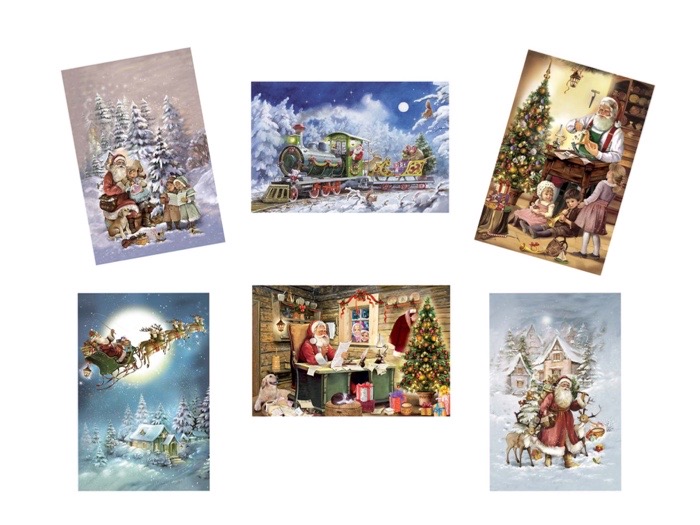 6-olika. Dubbelt kort med kuvert. Adventskalender med silverglitter och 24 luckor att öppna.