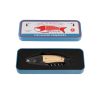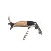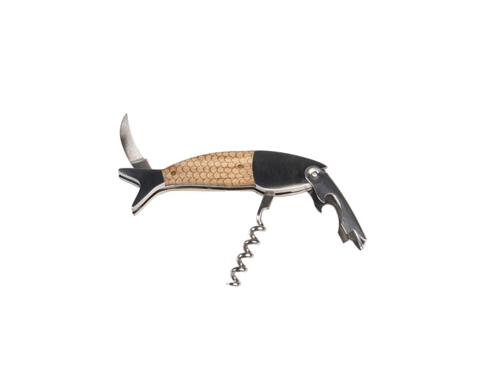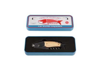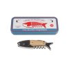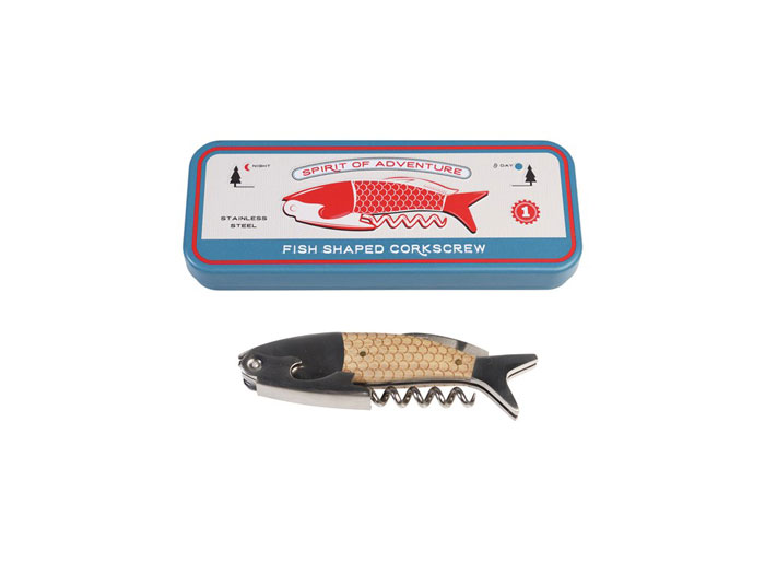 Fiskformad korkskruv i en fin plåtburk. Tillverkad av rostfritt stål och trä. Flasköppnare