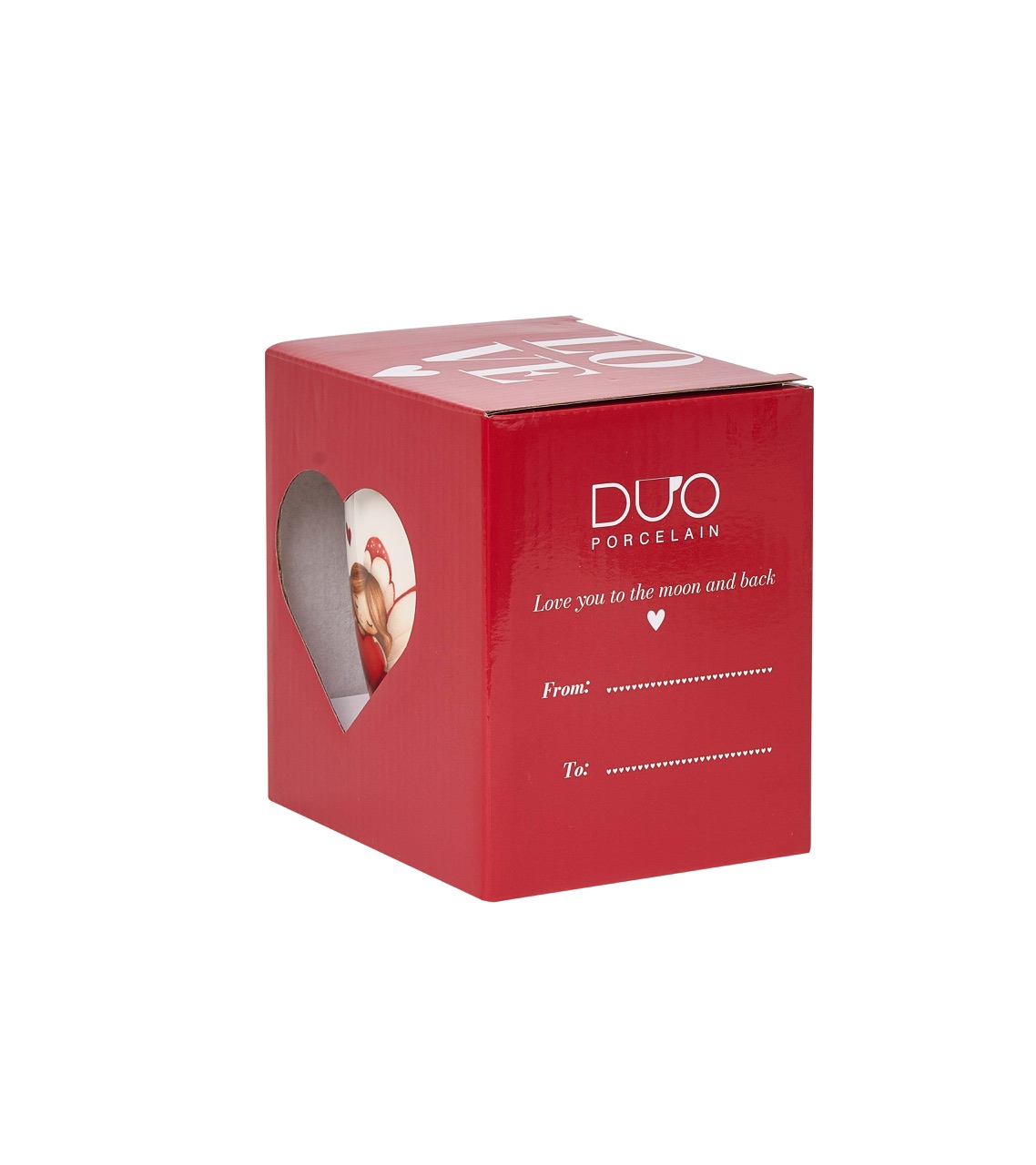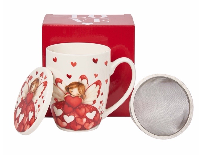 En porslinsmugg utav materialet New Bone China med romantiskt motiv av en ängel bland röda hjärtan, med matchande lock och tesil. Tål Maskindisk & Micro. Medföljer en fin presentförpackning.