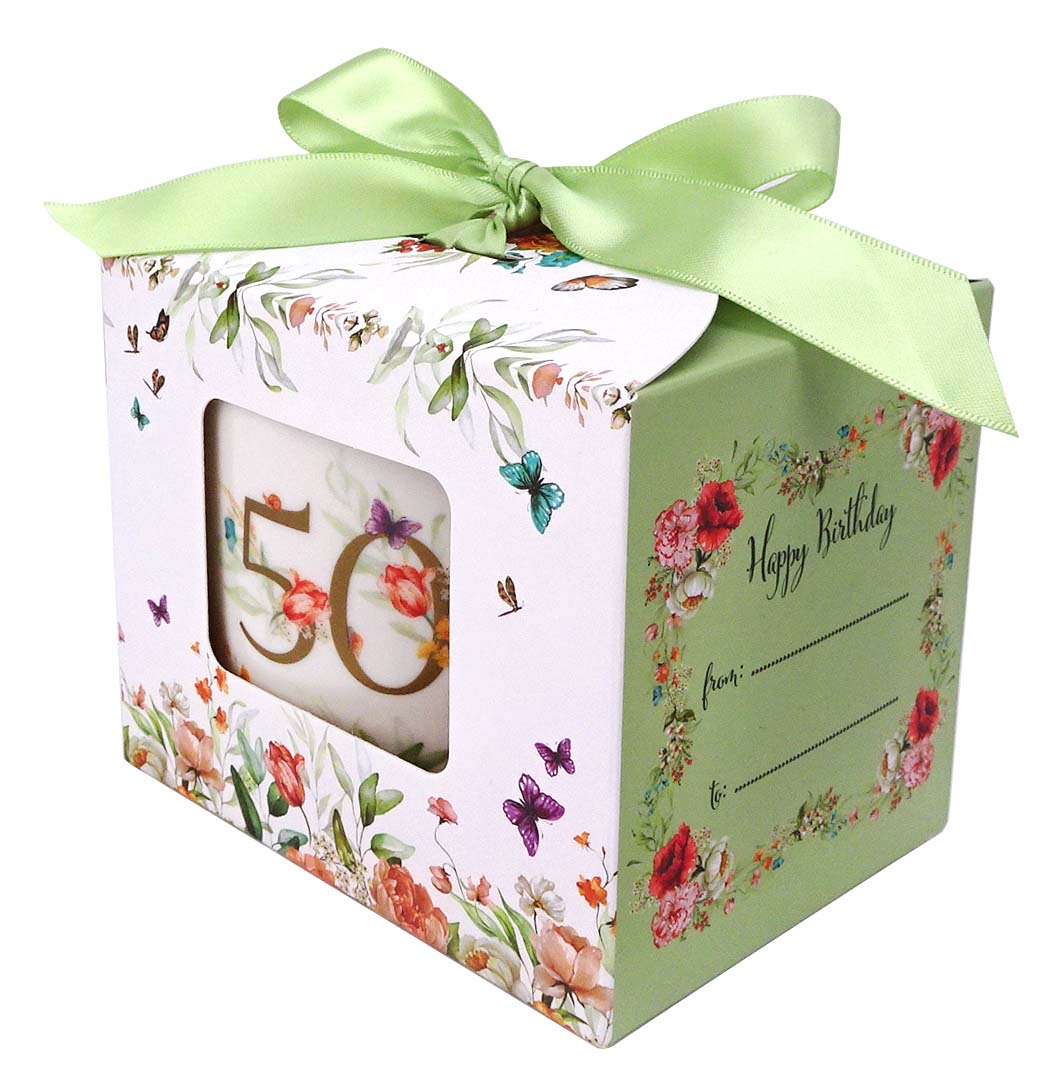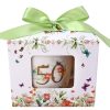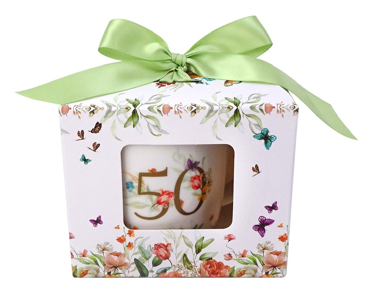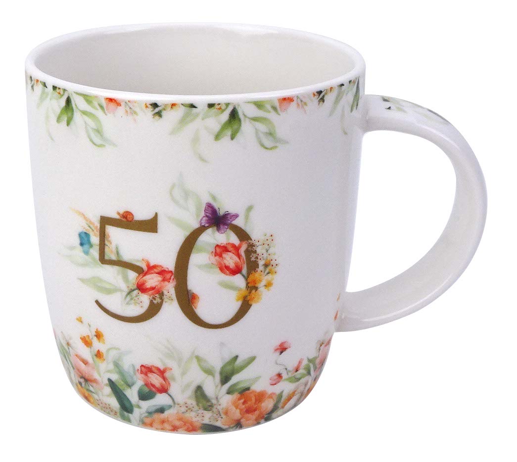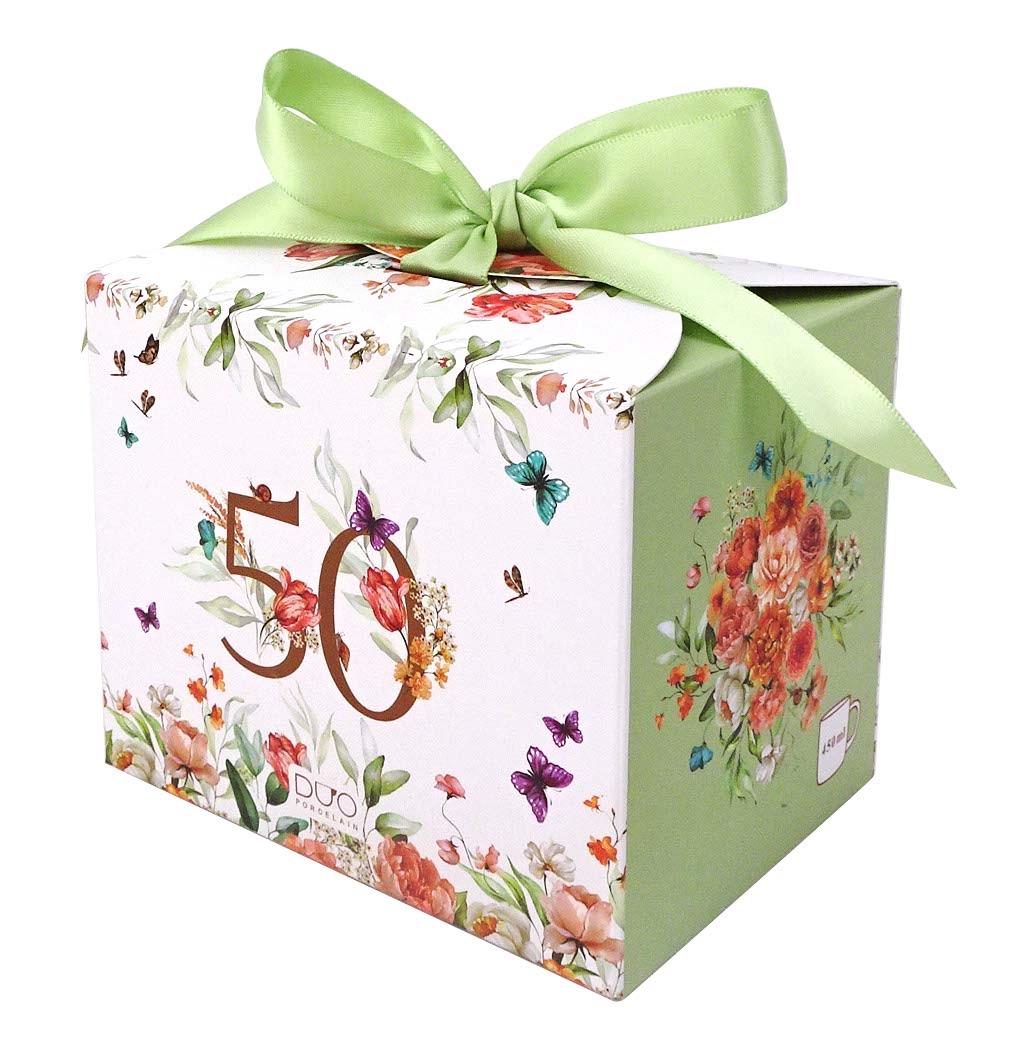 Mugg i presentbox – En elegant mugg i New Bone China med blommönster och siffran “50”. Levereras i en matchande presentbox med rosett, perfekt som present till 50-åringen.