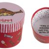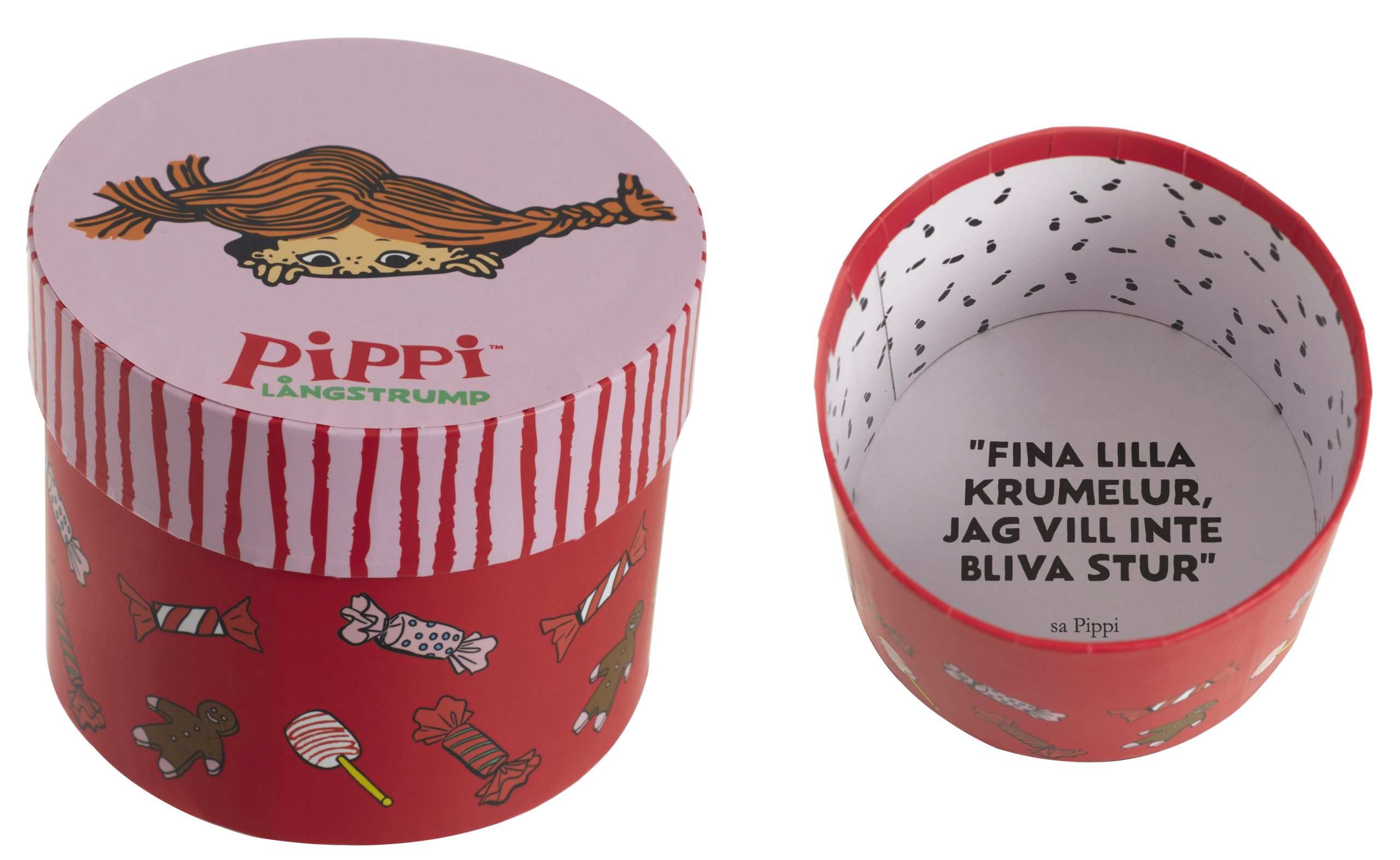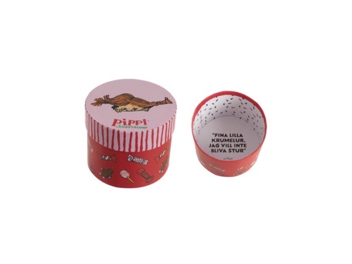 Rund presentask i papp med Pippi Långstrump-tema. Utsidan har julinspirerat motiv med godisar, och insidan är tryckt med citatet: “Fina lilla krumelur, jag vill inte bli stur”. Perfekt för små presenter, julgodis eller dekoration.