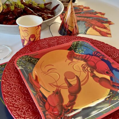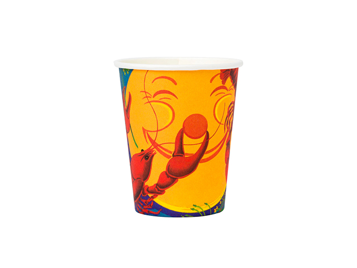 Pappersmugg Kräftskiva innehåller åtta stycken engångsmuggar med design föreställande kräftor och den klassiska månen.