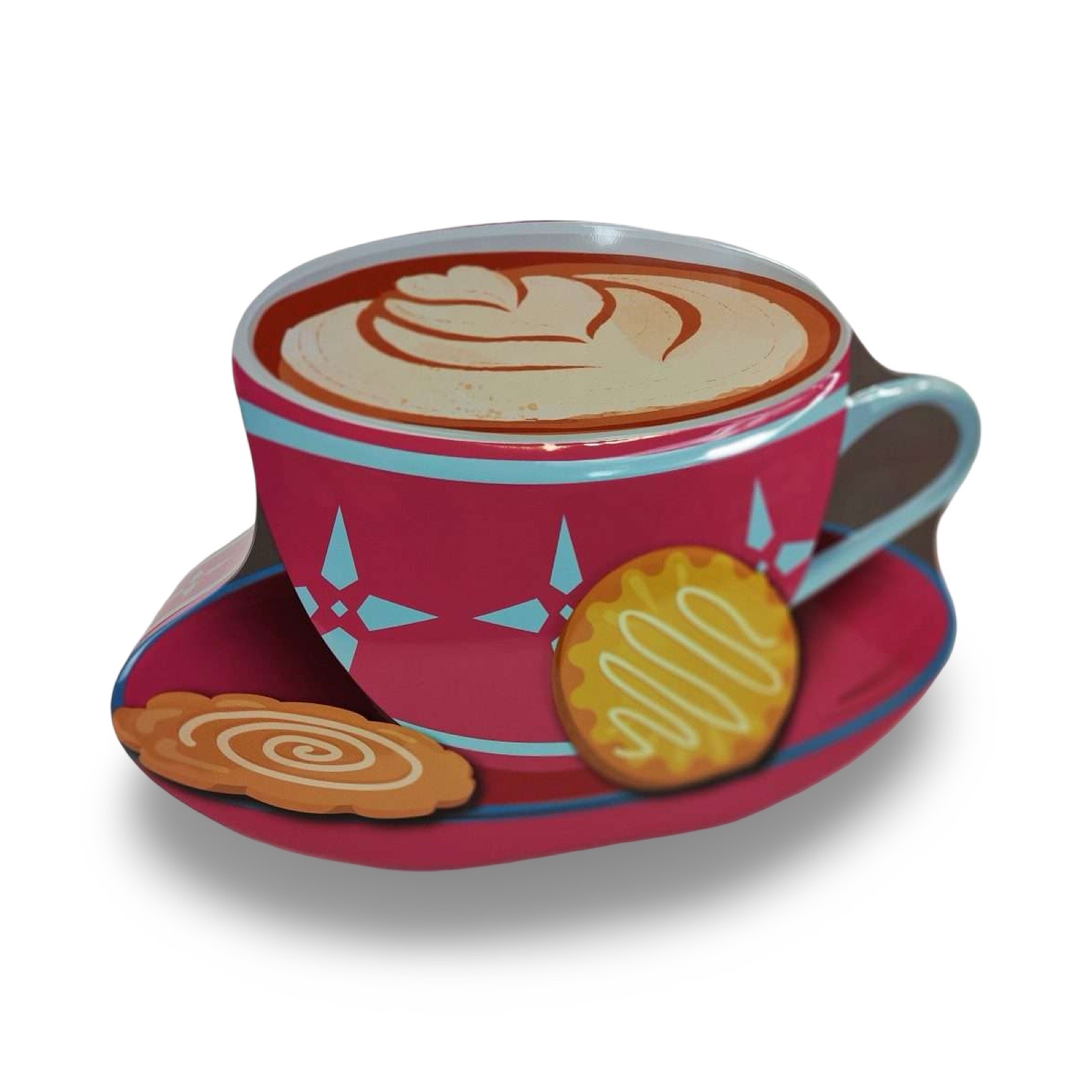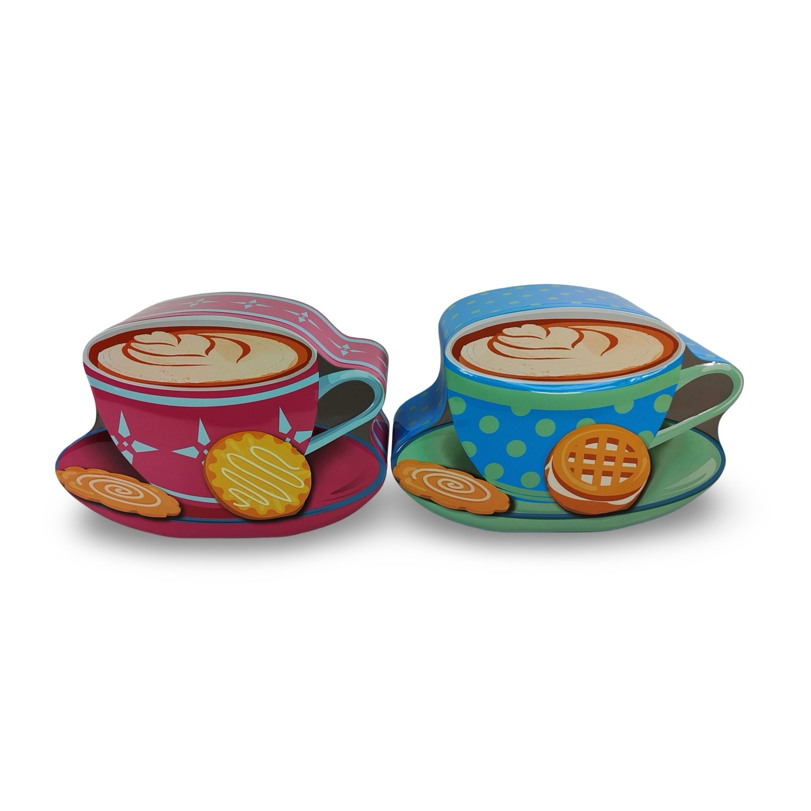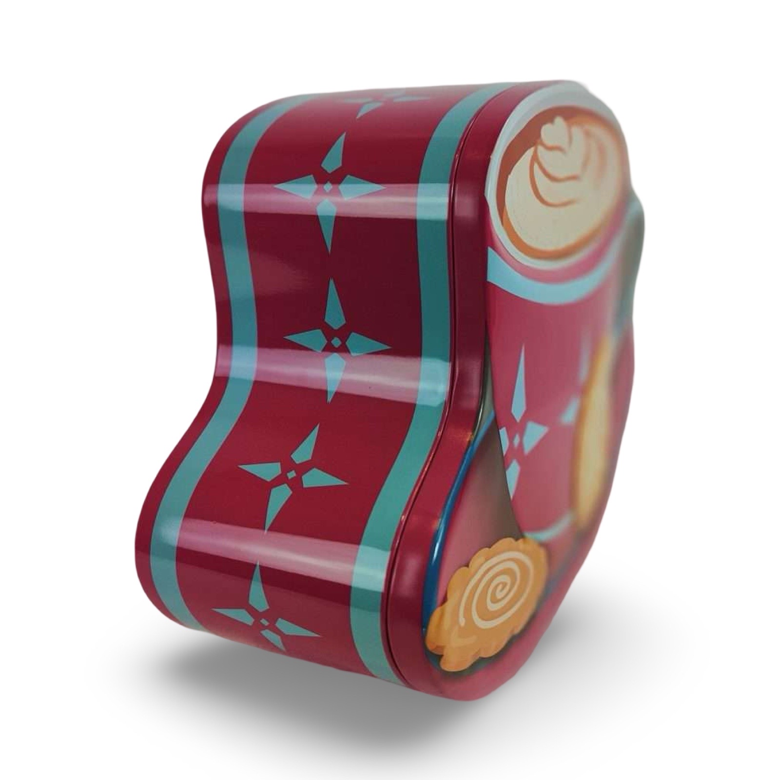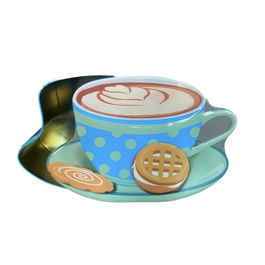 2-olika. Fin plåtburk i form av en cappuccinokopp med en kaka.