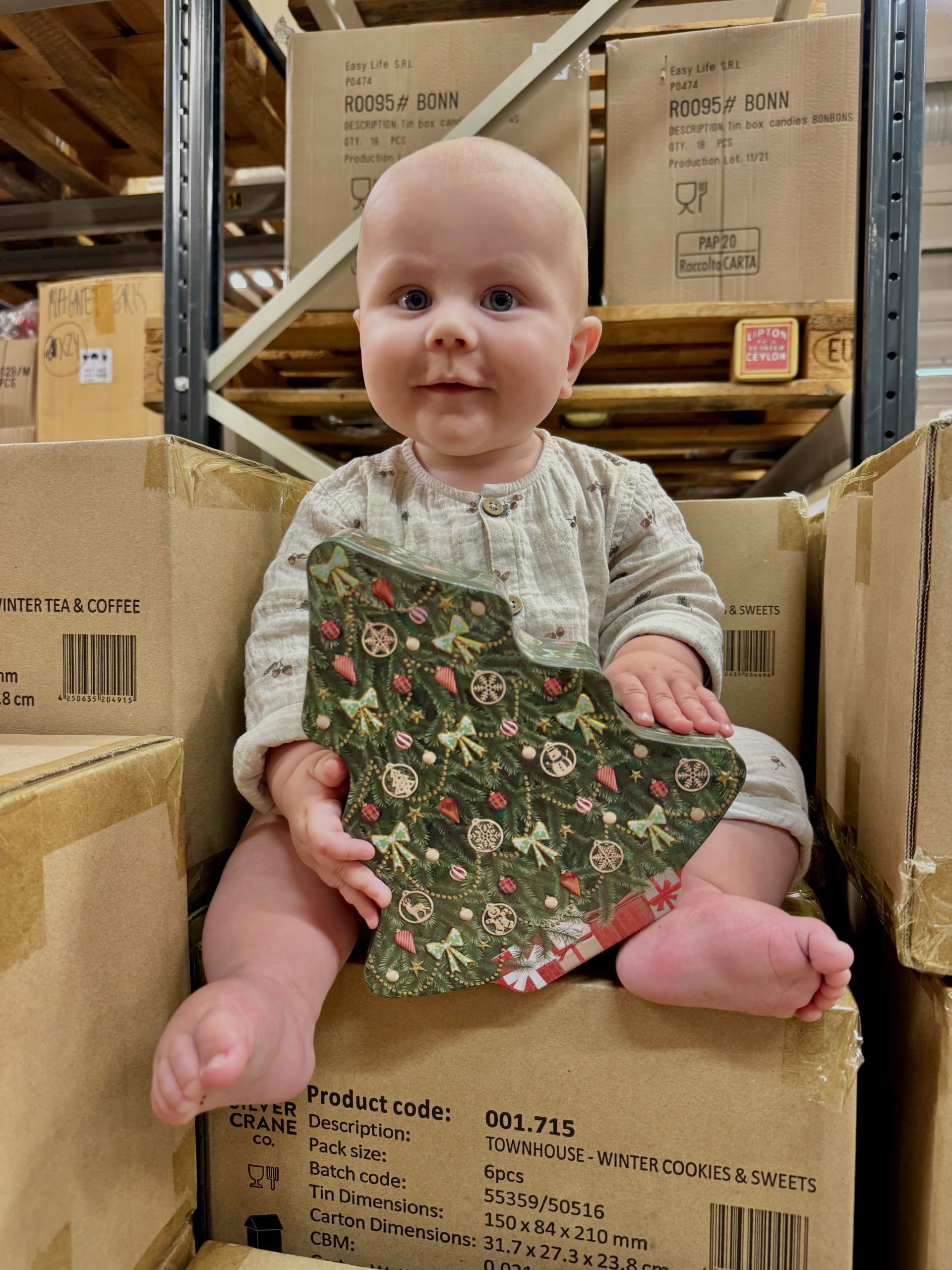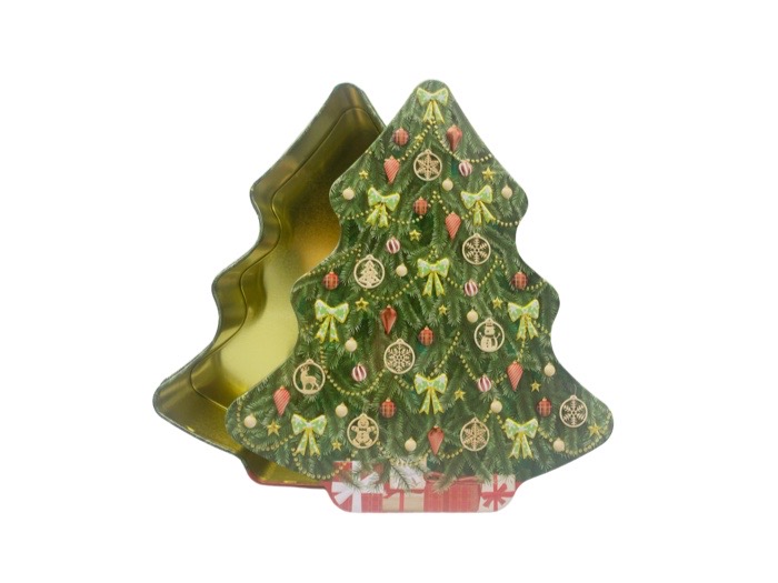 1000 ml. Fin plåtburk formad som en julgran med guldfärgade detaljer.