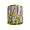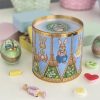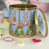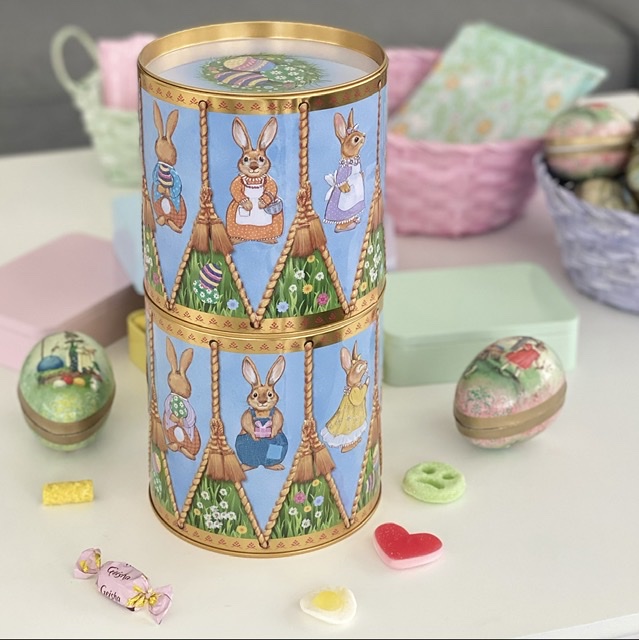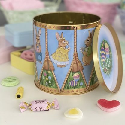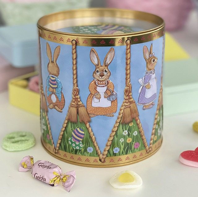 Fin präglad kakburk med lock som ser ut som en trumma. Runt burken ser du söta motiv av olika påskharar.