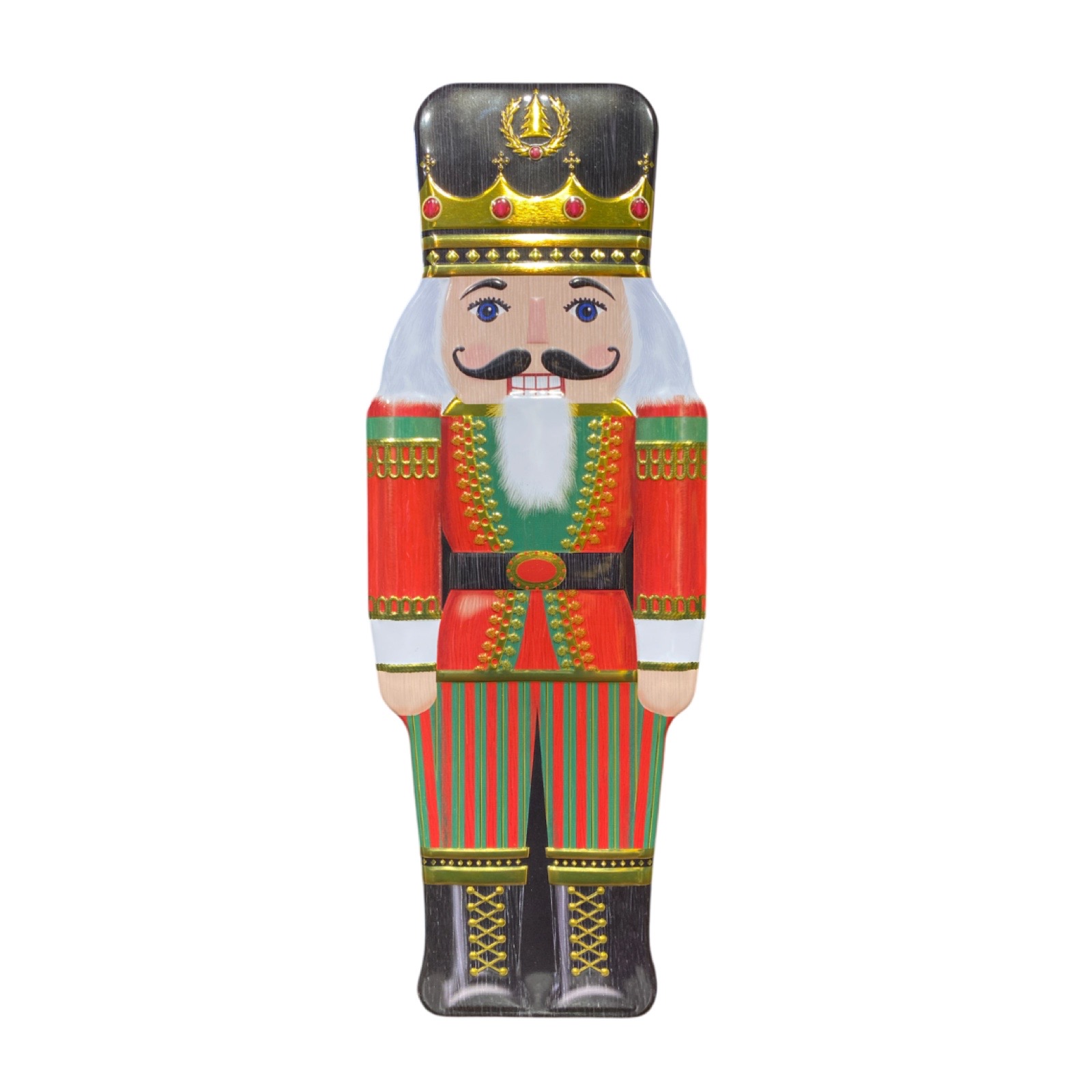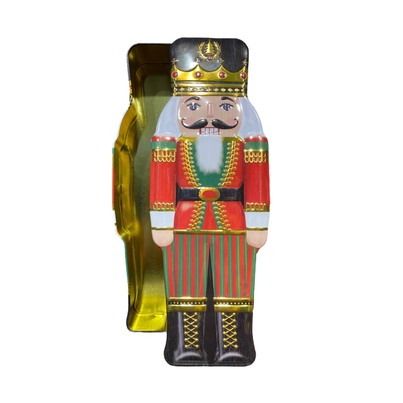 1200 ml. Fin plåtburk formad som en nutcracker med guldfärgade detaljer.
