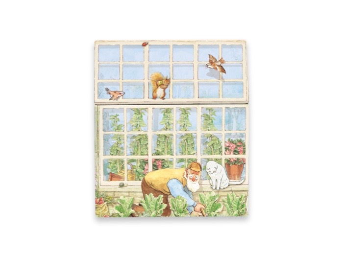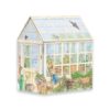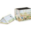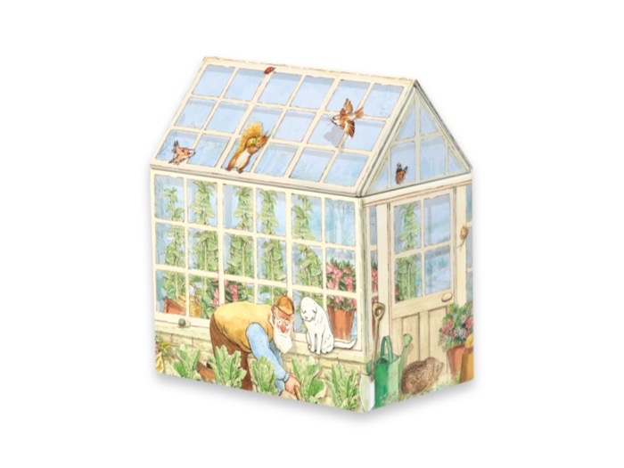 En alldeles underbar plåtburk med Beatrix Potters illustrationer av Peter Rabbit och hans vänner i växthusmiljö
