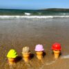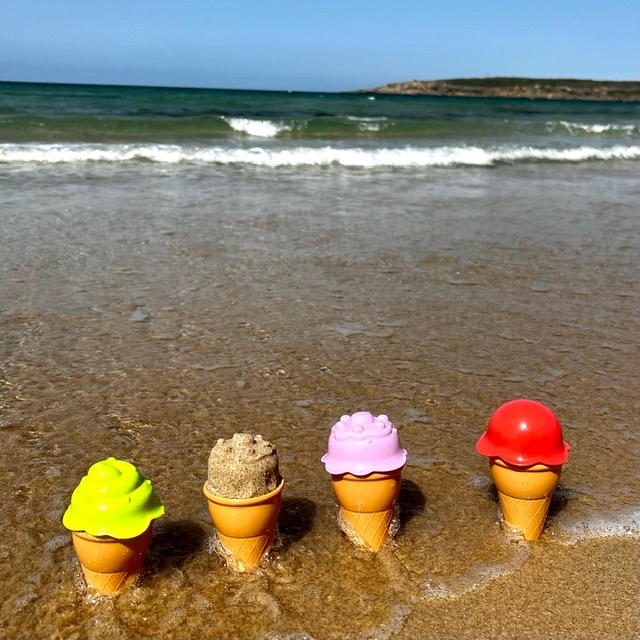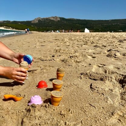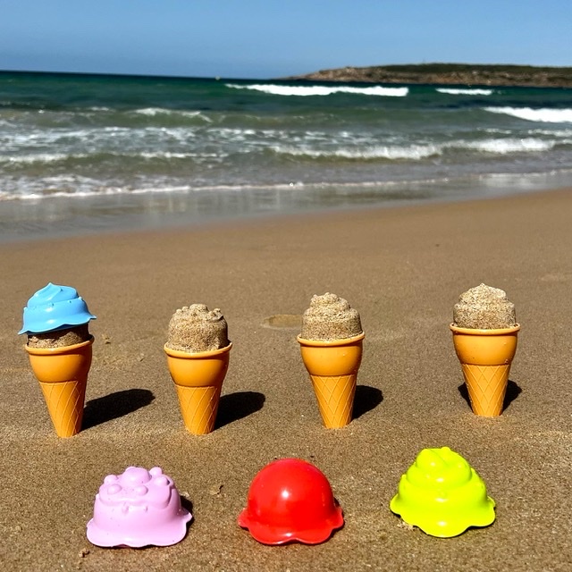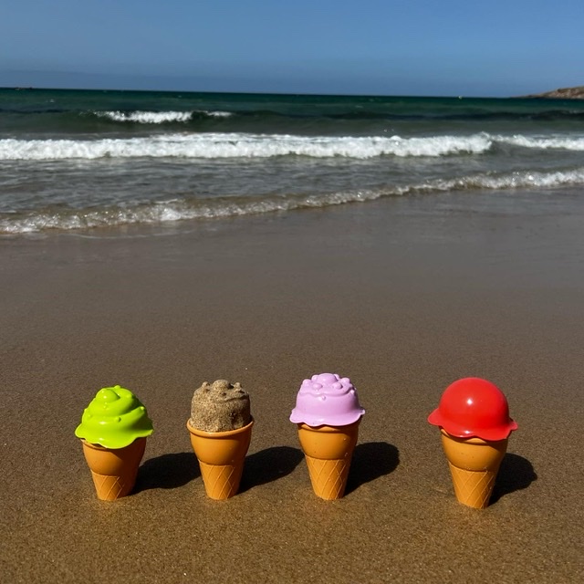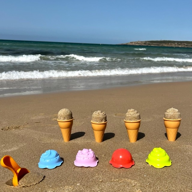 Förpackningen innehåller 4 st sandformar i form av en glasstrut, 4 st sandformar i form av en glasskula och en glasskopa som funkar perfekt för att skopa upp glassen (sanden) med. Made in Italy.