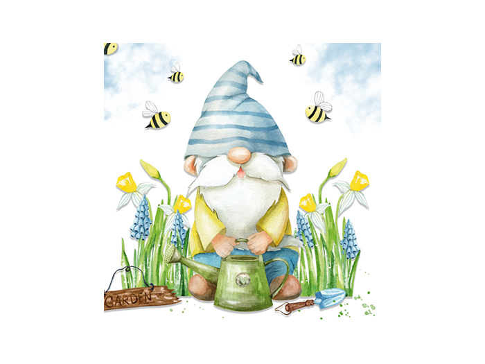 Servett med ett charmigt motiv av en trädgårdstomte omgiven av vårblommor och surrande bin. De glada färgerna skapar en varm och inbjudande känsla – perfekt för vårdukning.