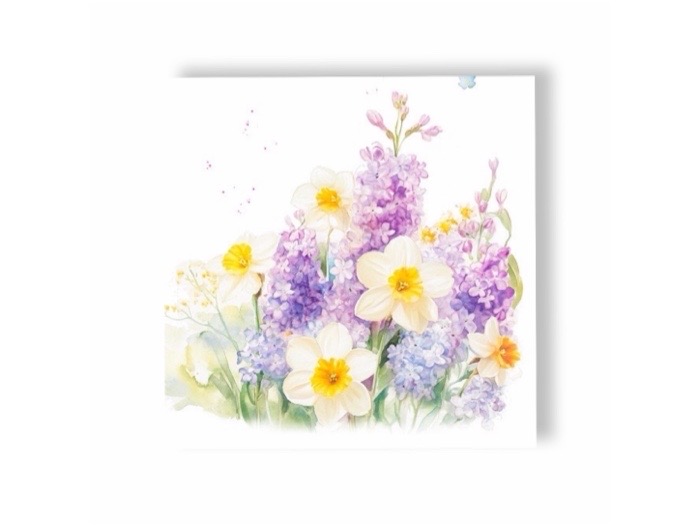 En vacker servett med ett mjukt akvarellmotiv av vårblommor i ljusa gula och lila toner. Perfekt för vår- och sommarbjudningar, påsk eller en dukning som vill kännas extra inbjudande.