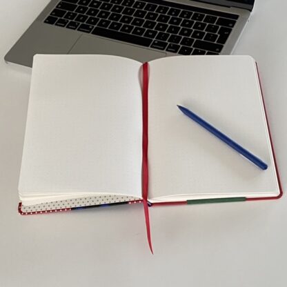 Expanderbar ficka till förvaring längst bak i boken. Sidmarkerare i matchande färg. Boken försluts med ett elastiskt band.
