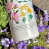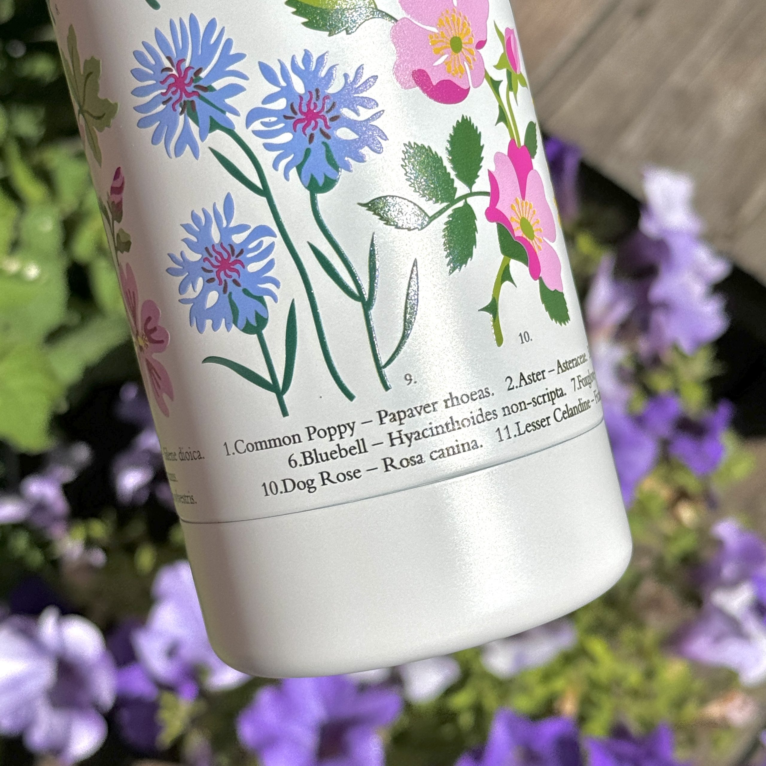 Designen är tryckt på flaskan med en speciell teknik som ger en snygg 3D-präglad effekt med dom vackra vildblommorna.