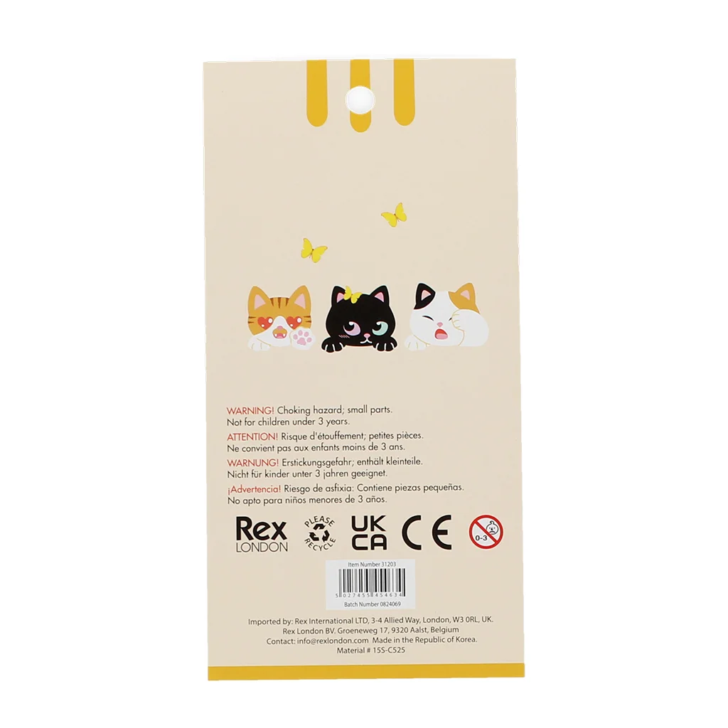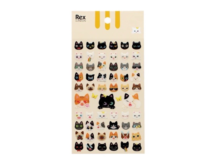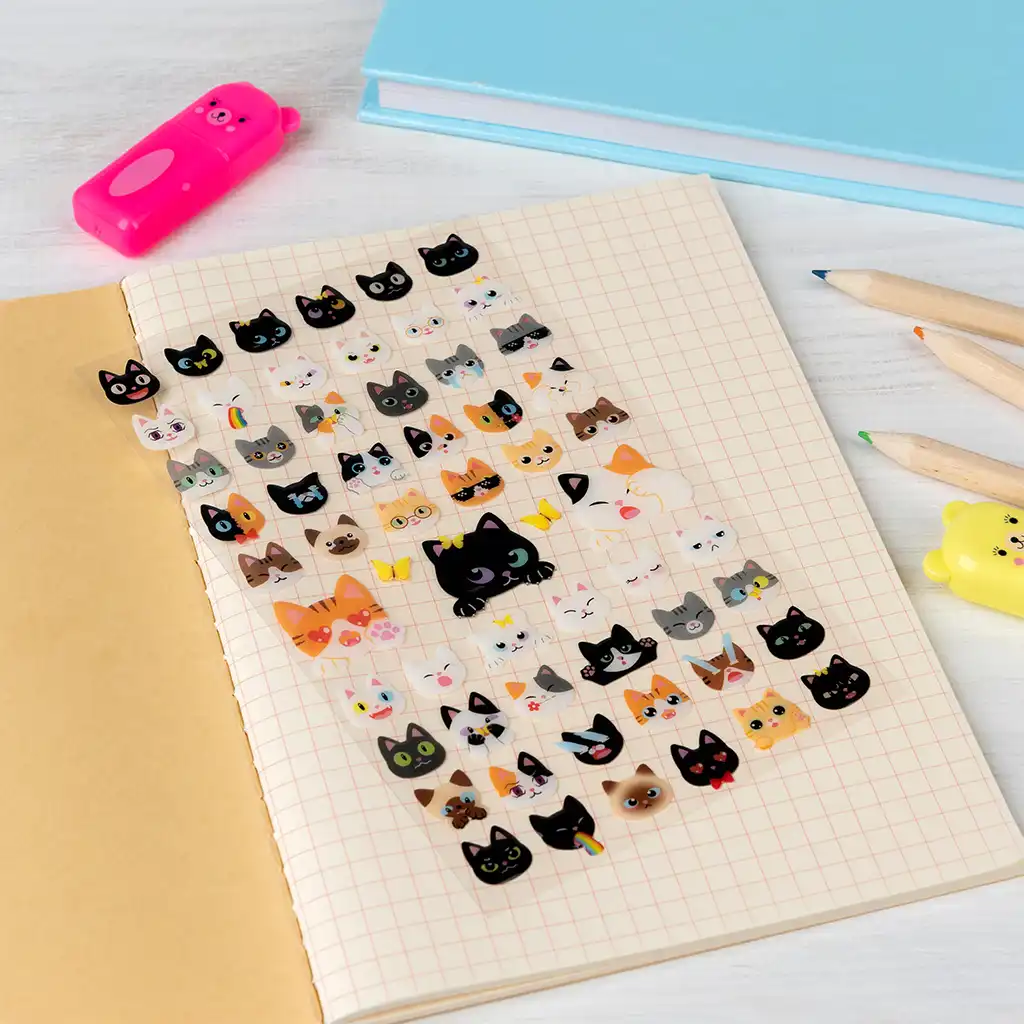 3D-klistermärken med motiv av tecknade söta och udda kattansikten på ett ark. Arket innehåller 59 klistermärken i olika former och storlekar